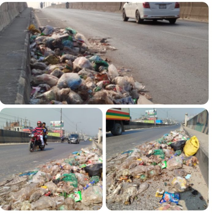 ঢাকা ময়মনসিংহ মহাসড়কের মাওনা চৌরাস্তা ফ্লাইওভারের ওপর ময়লার স্তুপ দূষণ–দুর্ভোগে অতিষ্ঠ পথচারী ও পরিবহনচালকেরা