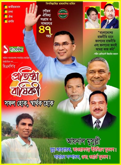 বাংলাদেশ জাতীয়তাবাদী দল বিএনপির ৪৭তম প্রতিষ্ঠাবার্ষিকী উপলক্ষে নেতাকর্মীসহ সমগ্র গাজীপুর সদর উপজেলার ভাওয়ালগড় বাসীকে শুভেচ্ছা জানিয়েছেন ভাওয়ালগড় ইউনিয়ন যুবদলের যুগ্ন আহবায়ক ও ৬নং ওয়ার্ড যুবদলের সাধারণ সম্পাদক আয়নাল মুসুল্লী।