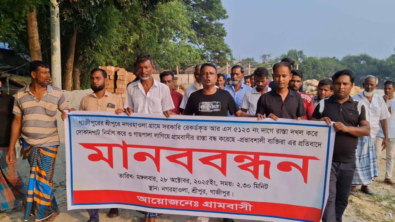 গাজীপুরের শ্রীপুর উপজেলার নগর হাওলা গ্রামে শত বছরের পুরনো সরকারি ‘গো হালট’ রাস্তা দখল করে মাটি বিক্রি ও দোকানপাট নির্মাণের অভিযোগে এলাকাবাসী মানববন্ধন করেছেন। মঙ্গলবার (২৮ অক্টোবর) বিকেল ৩টার দিকে স্থানীয় বাসিন্দাদের উদ্যোগে এ মানববন্ধন অনুষ্ঠিত হয়। এতে নারী-পুরুষসহ বিভিন্ন বয়সের শতাধিক মানুষ অংশগ্রহণ করেন। স্থানীয়রা জানান, গ্রামের প্রায় শতবর্ষী সরকারি রাস্তাটি দীর্ঘদিন ধরে সাধারণ মানুষ যাতায়াতের জন্য ব্যবহার করে আসছেন। সম্প্রতি একটি প্রভাবশালী মহল রাস্তা দখল করে মাটি বিক্রি ও স্থাপনা নির্মাণ শুরু করেছে। ফলে অন্তত দুই শতাধিক পরিবারের চলাচল মারাত্মকভাবে ব্যাহত হচ্ছে। অভিযোগ রয়েছে, দখলদার চক্রটি রাস্তার ওপর ঘরবাড়ি নির্মাণ, বাঁশঝাড় লাগানোসহ নানা অবকাঠামো তৈরি করেছে, যার কারণে পথটি সম্পূর্ণরূপে বন্ধ হয়ে গেছে। মানববন্ধনে অংশ নিয়ে স্থানীয় বাসিন্দা মো. রাকিব হাসান বলেন, “এই রাস্তা দিয়ে আমরা শিশুদের স্কুলে দেই, কৃষিপণ্য বাজারে নিয়ে যাই। এখন দখল করে আমাদের চলাচল বন্ধ করে দিয়েছে। আরেক বাসিন্দা মনির হোসেন বলেন, এটি আমাদের পূর্বপুরুষদের ব্যবহৃত রাস্তা। আজ আমাদের এই কষ্ট দেখতে হচ্ছে, এটা অত্যন্ত দুঃখজনক। এ বিষয়ে শ্রীপুর উপজেলা নির্বাহী কর্মকর্তা (ইউএনও) ব্যারিস্টার সজীব আহমেদ বলেন, “অভিযোগের কপি পেয়েছি। বিষয়টি তদন্তের জন্য সংশ্লিষ্ট ভূমি কর্মকর্তাকে নির্দেশ দেওয়া হয়েছে। সরকারি রাস্তা কেউ দখল করে রাখতে পারবে না। যাচাই-বাছাই শেষে আইনগত ব্যবস্থা নেওয়া হবে।