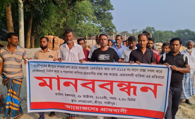 শ্রীপুরে শতবর্ষী সরকারি রাস্তা দখলের প্রতিবাদে এলাকাবাসীর মানববন্ধন